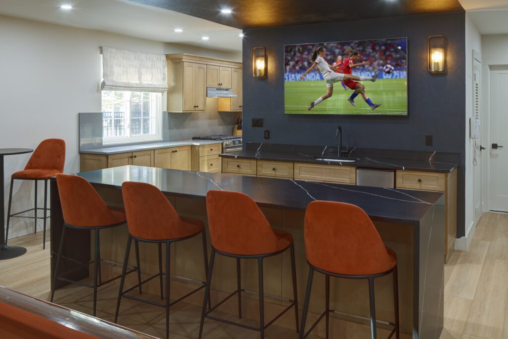 Defined areas were carefully created to allow simultaneous activities without disruption: Two library seating areas are complete with performance fabric upholstered, comfort-height seating with built-in charging stations to serve as quiet reading nooks or casual conversation spaces. A dedicated game and pub area includes a bar, refurbished pool table with new felt, a card table, and space for a roll-in ping pong table. A dual-purpose game table now flips over for poker play or other solid-surface needs.