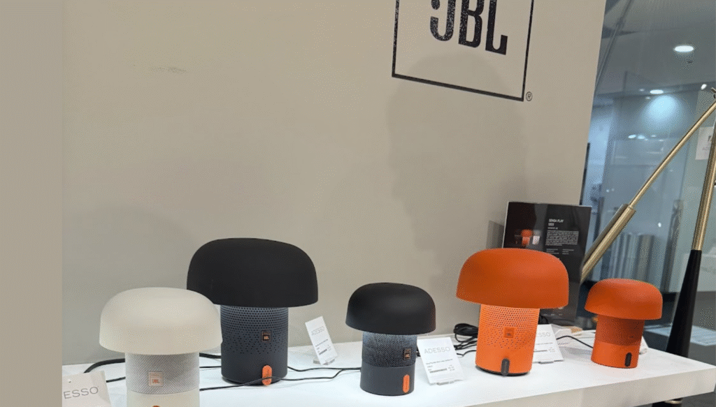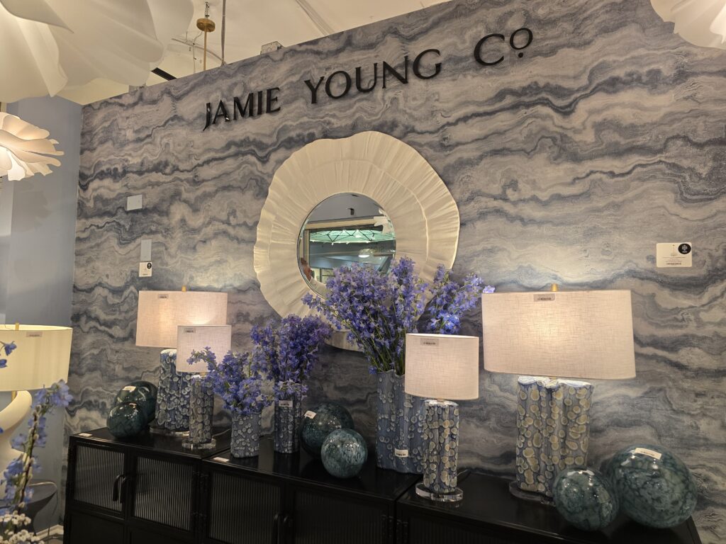 From left to right: Hubbardton Forge created portable lamps that coordinated with popular linear fixture series as well as table lamps that featured an outer glass. Adesso Home debuted what company founder Lee Schaak described as the largest assortment of battery-powered accent lamps available in the industry. Adesso unveiled an exclusive partnership with electronics company JBL on a line of accent lamps that contain JBL Bluetooth speakers. Natural materials and oversized scale distinguished new lamps from Jamie Young Co. The entrance of Jamie Young Co’s showroom epitomized the trend for a soft blue palette as well as an organic theme for the shapes and patterns on the lamps.