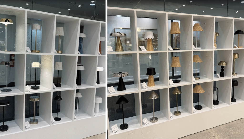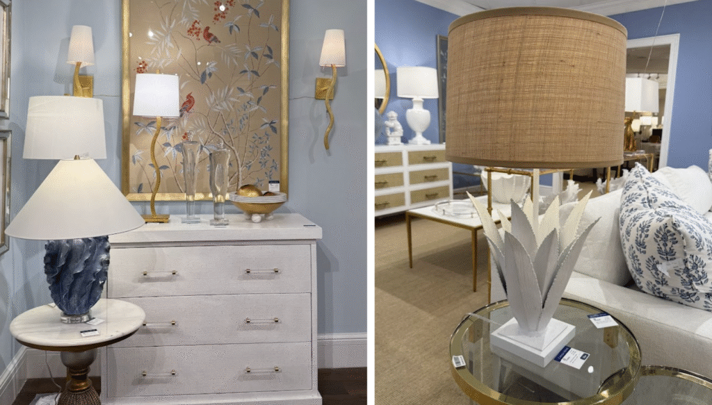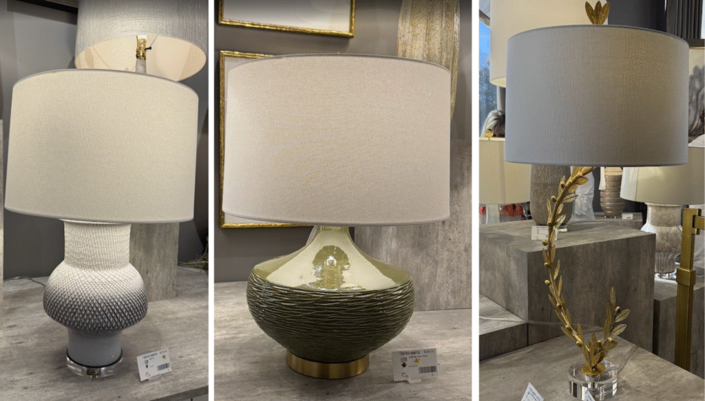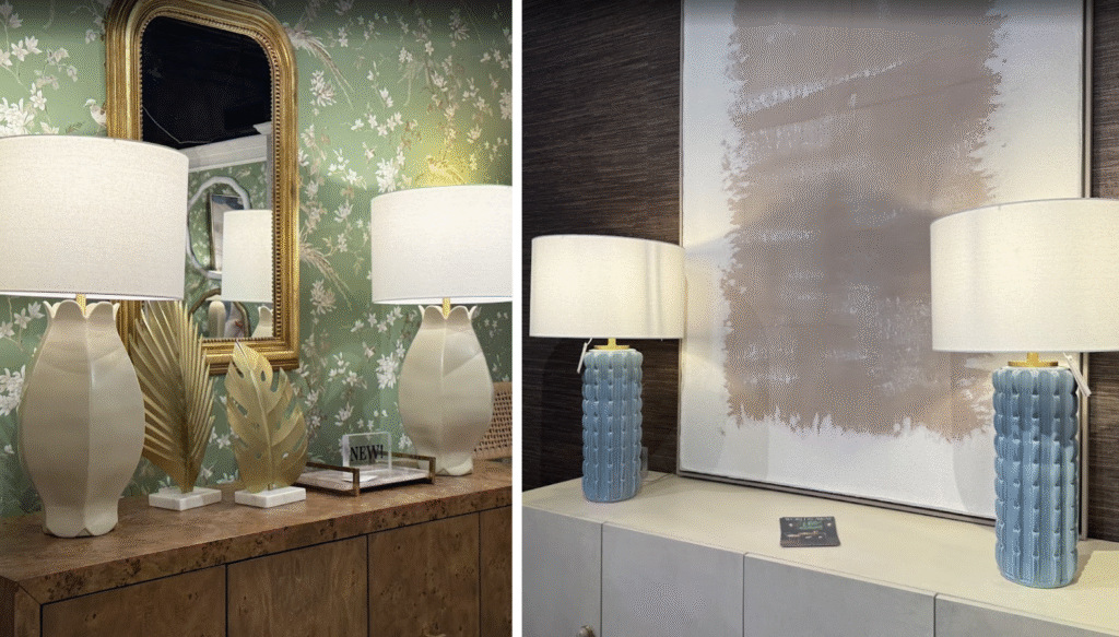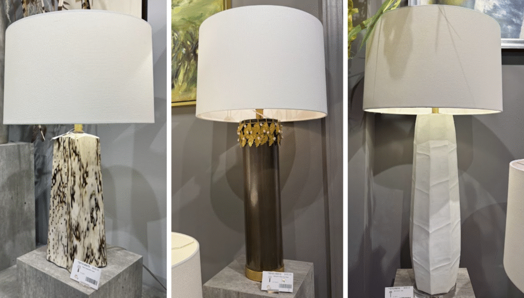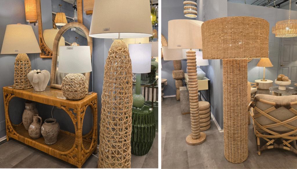 Natural materials (think rattan, grasses, and wood) as well as organic motifs (images of flower petals, blossoms, and branches) were abundant throughout market. Popular colorways fell into two primary camps: neutral beiges and browns that evoke Pantone’s 2025 Color of the Year Mocha Mousse, and tranquil blues and greens that were deeper than pastels but soft enough to work well with botanically inspired or nature-themed room decor. Here are some of the new portable lamps that LNN spotted at High Point Market.