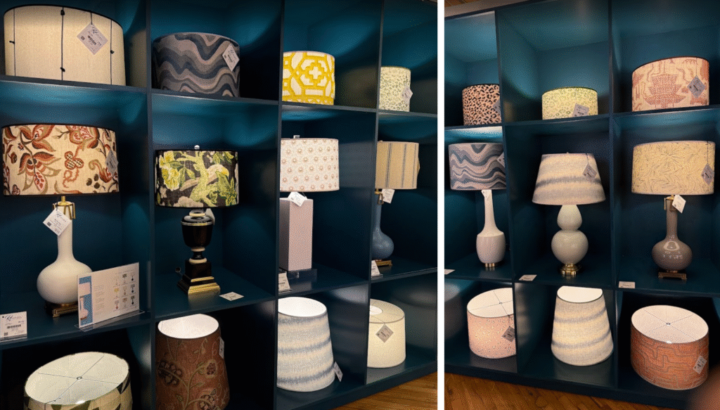 While scale seemed to be all over the map – from overly tall floor lamps and full-bodied table lamps to suit newer, large rooms to slim, narrow profiles and heights of under 30 inches to complement smaller spaces – there were several colorways and patterns that were pervasive.