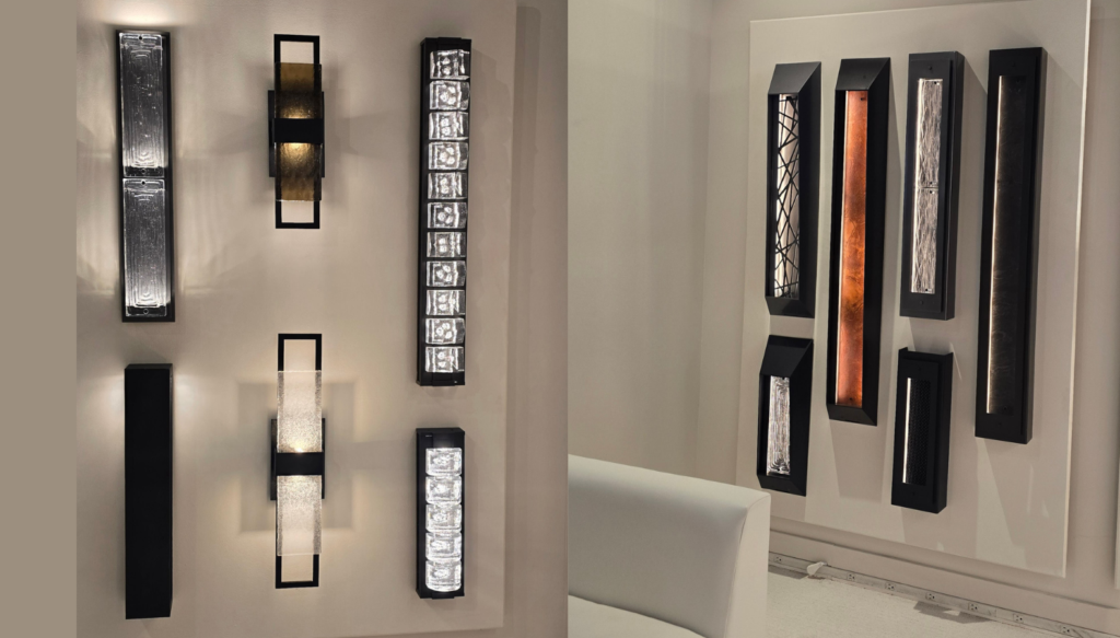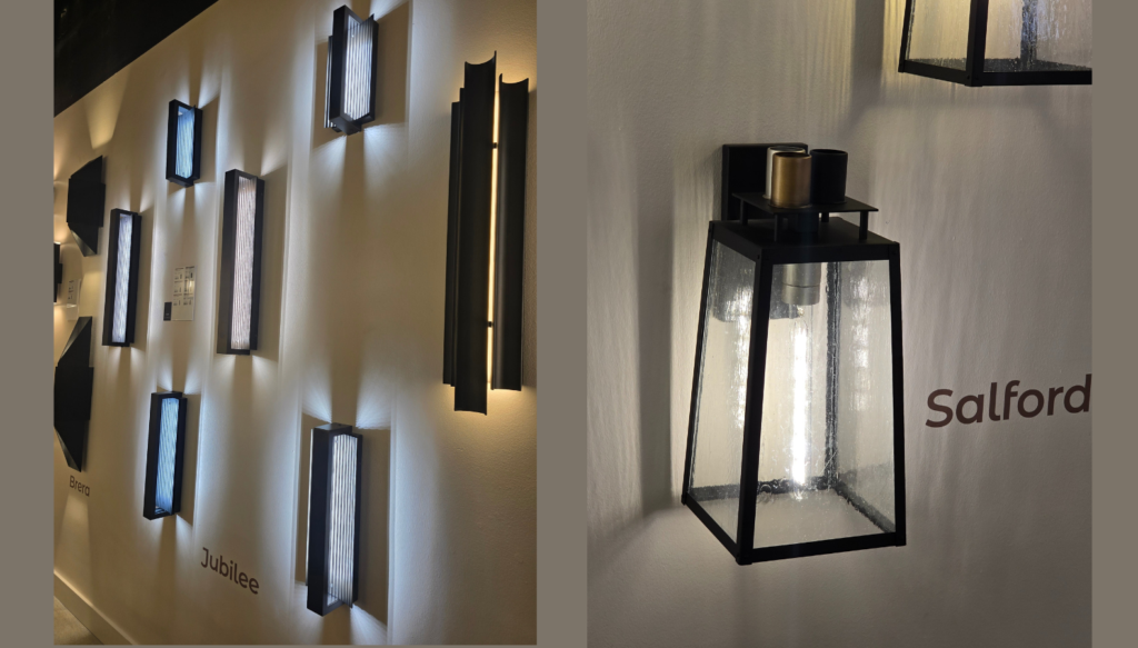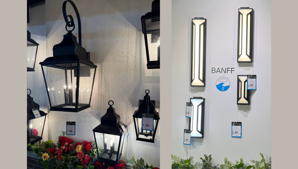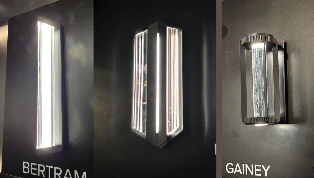At Alteck Lighting, the novel use of Fiberglas (left) allowed for freeflowing and detailed shapes; the Corinthian model demonstrated large scale for tall entryways; the Wave (second from right) is a stylish version of a Dark Sky-compliant fixture; and Abby demonstrated a corrugated stone backplate that can blend almost seamlessly with certain building facades. January Lightovation marked the unveiling of Innovations Lighting’s new outdoor lighting category. The company acquired manufacturer Brass Traditions in July.Hubbardton Forge debuted a new marine-grade finish in white (left), along with a few sculptural styles, plus an exterior art glass shade series that coordinates with a popular indoor collection (note the double-shade vertical style for greater height).Continuing the coordination between indoor and outdoor styles, Hubbardton Forge’s new Stowe series debuted. Same metal component, different feel. Hubbardton Forge’s vp/marketing Jeanne-Marie Gand pointed out that the fixtures on the left have a more contemporary flair while the street light version on the right evokes an arts and crafts vibe. Z-Lite’s creative director Tim Stumm noted that the new lantern series on the left can be installed with or without the long, curved bracket depending on customer preference or the size of the entryway. The new Banff series, at right, offers a distinctive Deco aesthetic.At Hammerton, new vertical fixtures in a variety of materials, styles, and sizes were noteworthy.Eglo’s new outdoor selection (left) showcased several sizes in contemporary styles, while Salford offers a choice of three finishes (samples on top of the fixture) to personalize the look. Avenue Lighting’s latest outdoor fixtures were both sculptural and generously proportioned to suit several contemporary home types.Casual and tropical looks were among the new intros at Avenue Lighting, which designated a large room specifically for its outdoor collections. Crystal served as the focal point for new outdoor fixtures in the Beyond by Schonbek line, part of WAC Group.