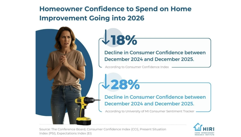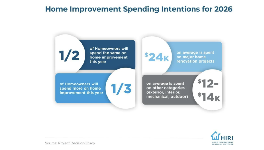 While overall home improvement spending declined at the end of 2025, based on HIRI’s data, “fewer completed projects led to higher spend per project, which implies tighter prioritization and deeper investment in essential or higher-value work. Intentions around home improvement spending seem to be steady as we kick off 2026, signaling a measured and cautious outlook rather than retrenchment, with homeowners maintaining intent while calibrating budgets and project scope. About half of homeowners expect to spend roughly the same amount on home improvement in the next year as they did in the year prior. Another third expect they will spend more in this area.”