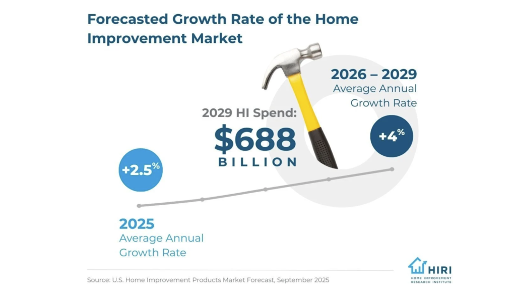 The home improvement products market was projected to increase about 2.5% in 2025, with an average 4% annual growth rate from 2026 to 2029. The market is forecasted to reach about $688 billion by 2029, based on data from HIRI’s U.S. Size of the Home Improvement Products Market study.