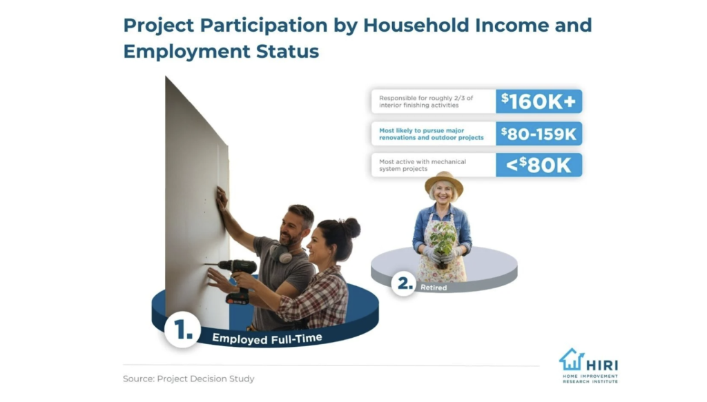 HIRI’s Project Decision Study shows that home improvement projects skew toward full-time employed households, with major renovations occurring among the most economically active owners. Retired homeowners are typically the second-most represented demographic when it comes to parsing who is pursuing home renovations. However, that distinction is significantly less for major renovations, as well as interior finishes.