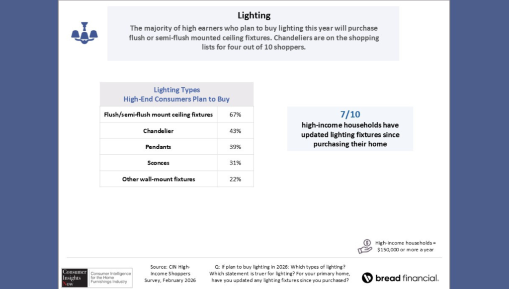 CIN research is conducted twice a year on behalf of Lighting News Now and its sister publications Home News Now, Casual News Now, Design News Now and Bedding News Now. This spring’s edition, sponsored by Bread Financial, focuses on high-income consumers: their plans for purchasing home furnishings, shopping preferences, feelings about interior designers and the style of their homes, and more. The survey also asked about lighting. More on that in a moment.