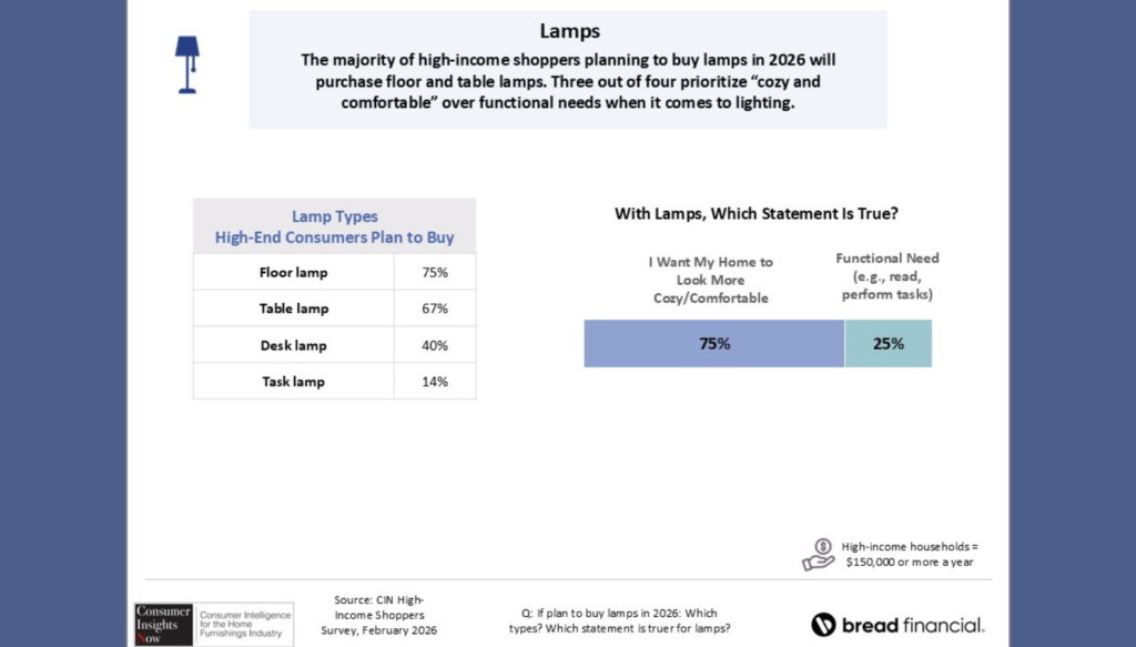 Three-quarters of high-income consumers say they prioritize lamps that will help them create a “cozy and comfortable” environment, while one-quarter of these lamp shoppers are seeking task lighting to help them work, read or do other activities.