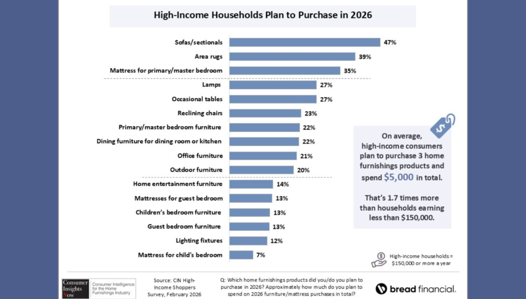 According to the survey results, households making $150,000 or more annually plan to purchase three home furnishings products in 2026 and plan to spend $5,000 in total. That’s 1.7 times more than households earning $150,000 or less.