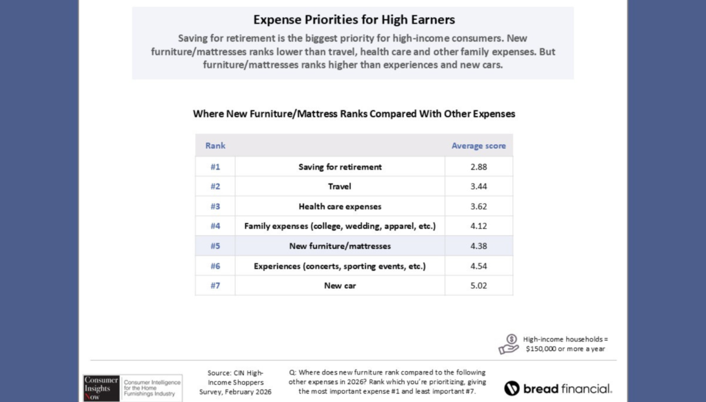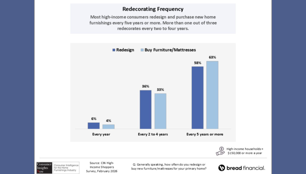 This spring’s CIN research surveyed 825 U.S. consumers with annual household incomes of $150,000 a year who have purchased – or plan to purchase – home furnishings in 2026. The survey was fielded in February. Veteran consumer researcher Dana French conducts the CIN survey
