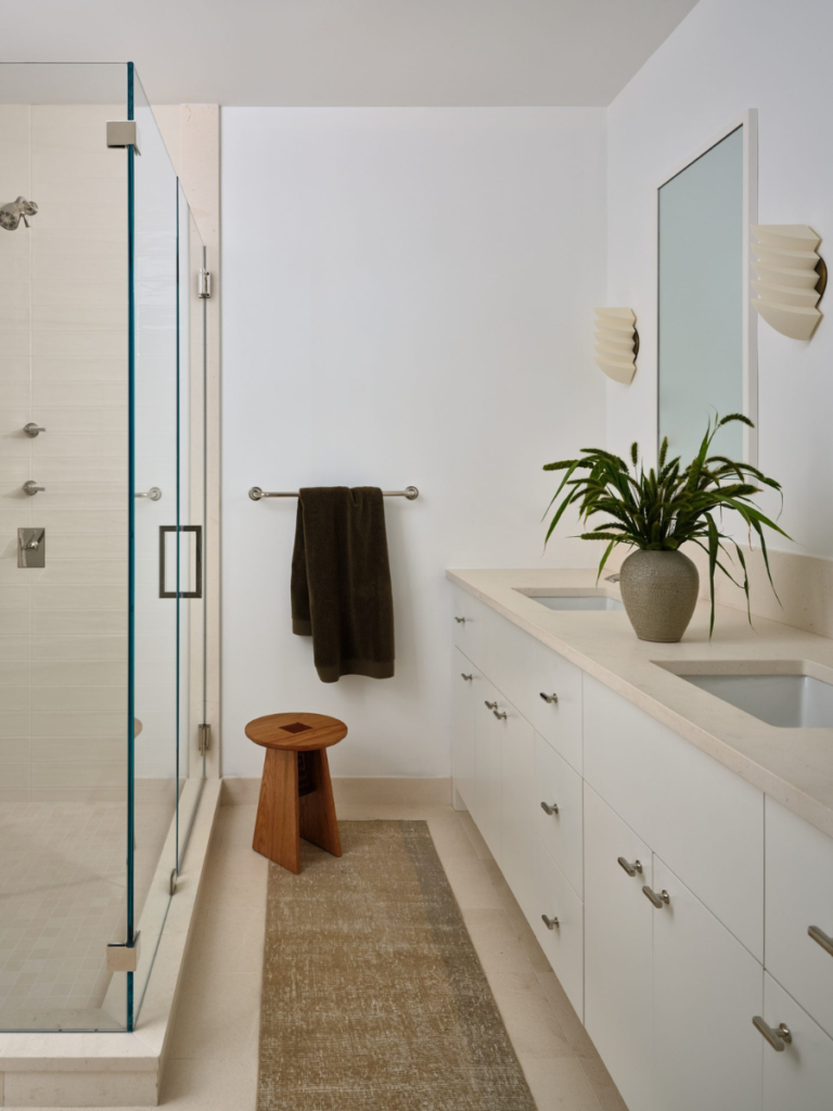 Large shower spaces, like the glass-enclosed one in this bathroom designed by Carta Creatives, are dominating today’s bathrooms. Photo credit: Kyle J. Caldwell