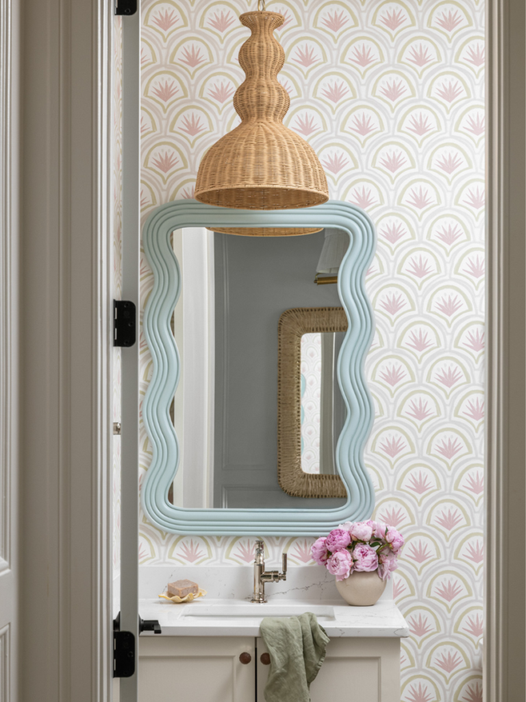 Powder rooms, like this bath designed by Georgia and Hunt Design House, are a place to play with more whimsical or dramatic design elements — and standout lighting fixtures.