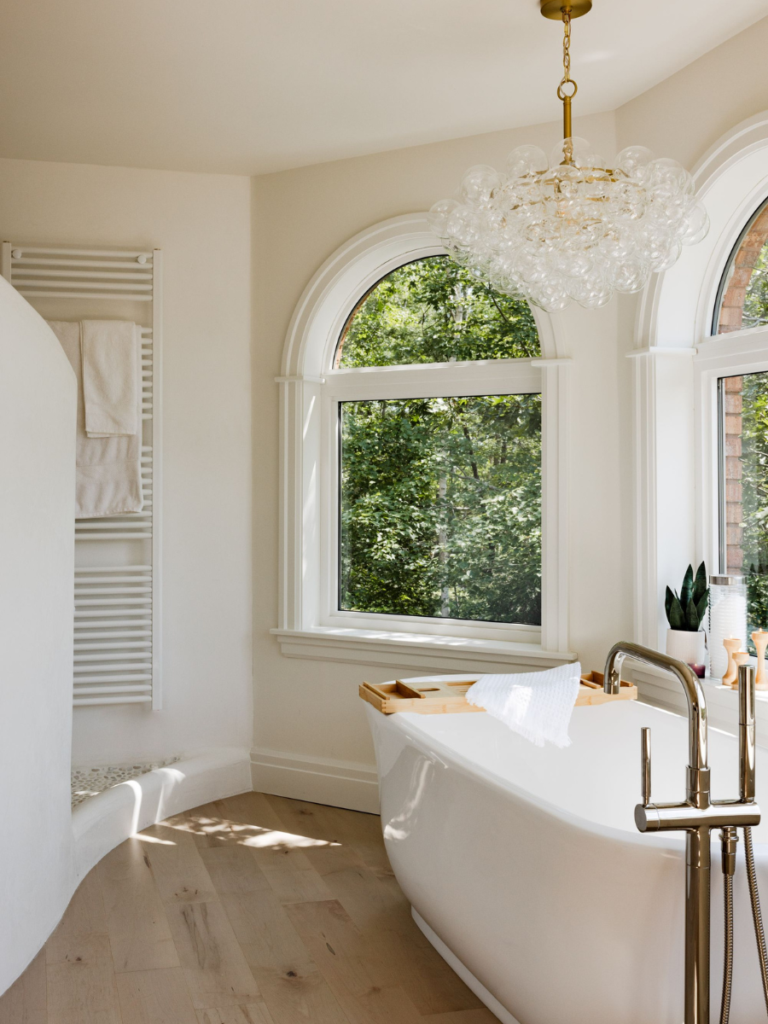 Spa-like baths with natural materials and lots of bright whites, can still feel homey, as this design by Stil James shows. The bubble-like pendant above the soaking tub is a fun touch. Photo credit: Carolina Andrade