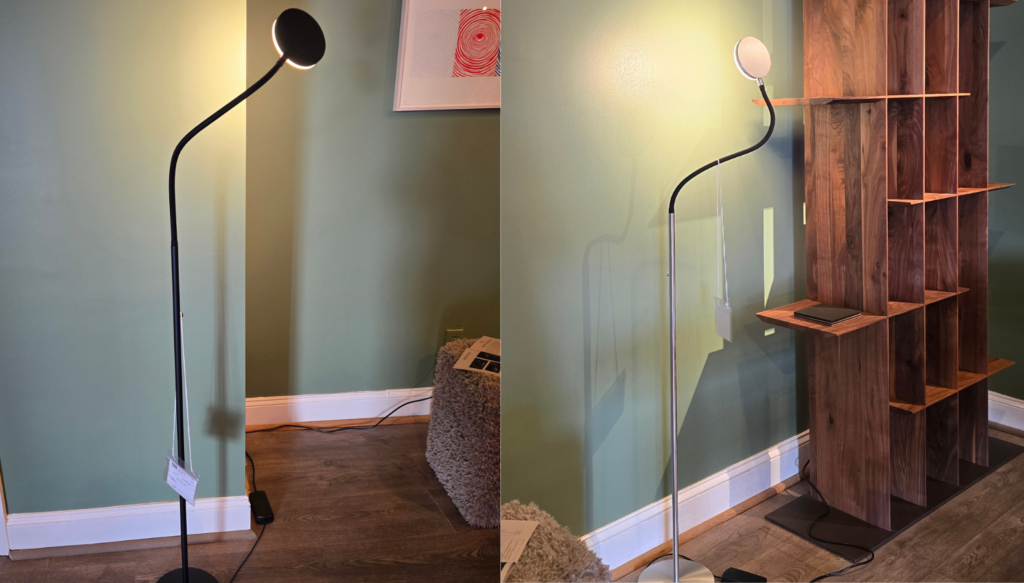 One of the new products is the Flex floor lamp, which has a fabric cord-covered flexible gooseneck for versatile aiming.